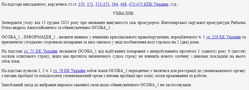 Про це йдеться у вироку Корольовського райсуду Житомира від 10 січня 2021, оприлюдненому в Єдиному державному реєстрі судових рішень.