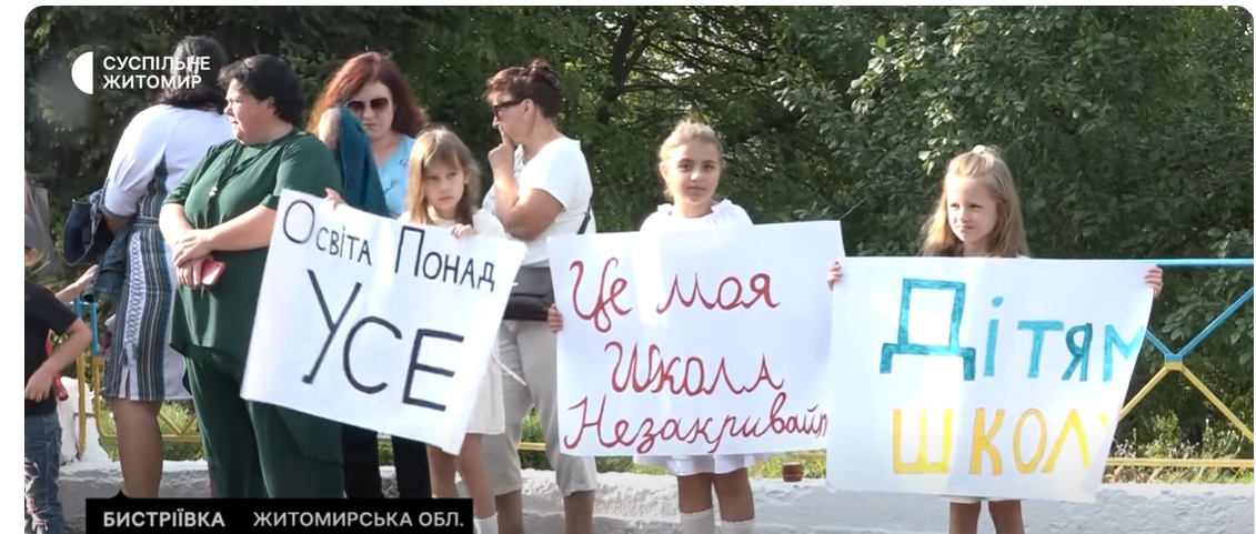 У селі Бистріївка, що на Житомирщині, народні протести: 1 вересня діти та батьки влаштували «перший дзвоник» біля зачинених дверей школи. Разом з букетами квітів вони принесли гасла «Це моя школа, не закривайте!». Позбавлення Бистріївської гімназії фінансування чиновники Вчорайшенської сільської територіальної громади пояснюють тим, що у школі всього 32 учні. На лінійку-мітинг вийшли… 46 дітей шкільного віку.
