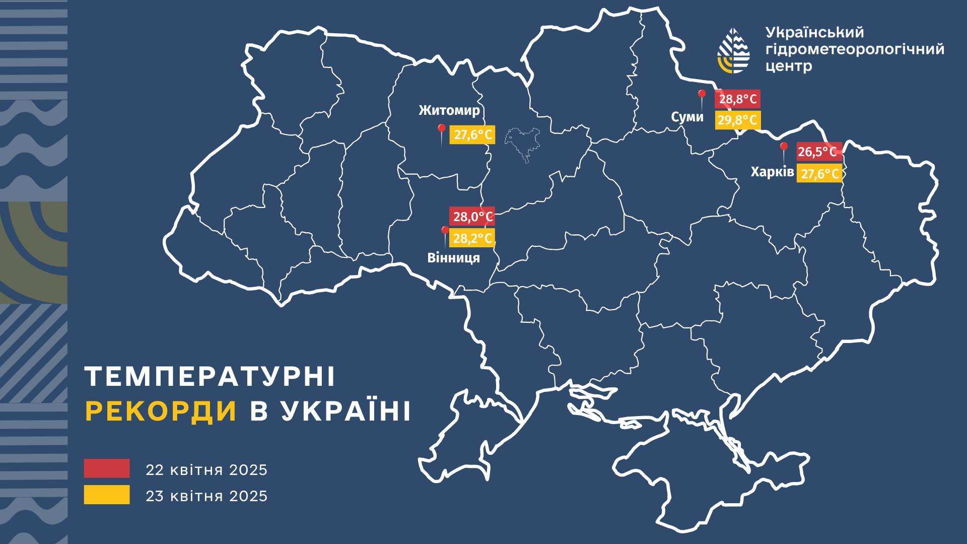 «Температурні рекорди в Україні 22-23 квітня 2025 року. Перегляньте карту нижче, щоб дізнатися, які значення температури спостерігаються у різних областях», – йдеться в повідомленні.