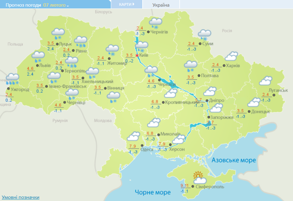 Карта погоди в Україні 7 лютого (фото: meteo.gov.ua)
